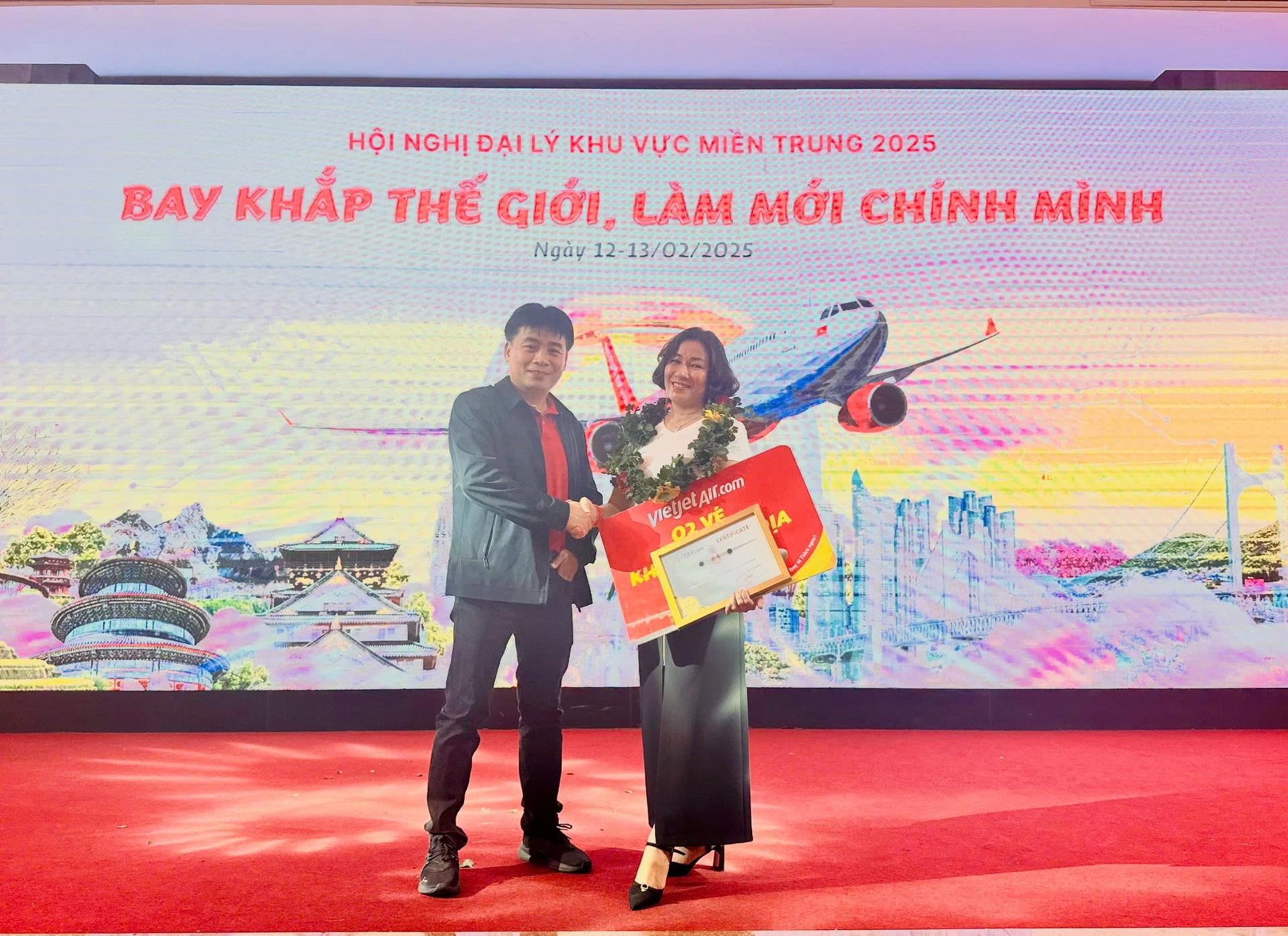 Đại diện Công ty TNHH Du Lịch Khám Phá nhận giải thưởng từ Vietjet Air.