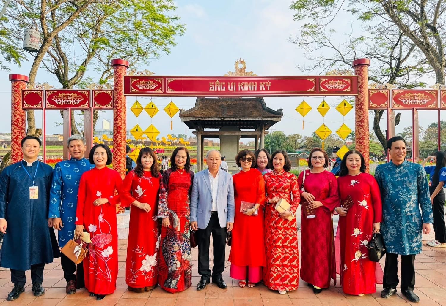 Ngay khi bước qua cổng chào "Sắc Vị Kinh Kỳ", chúng tôi đã bị choáng ngợp bởi không khí lễ hội. Các thành viên trong đoàn đều diện những tà áo dài truyền thống – trang phục không thể thiếu khi du xuân đất Cố đô.